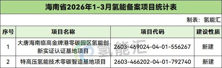海南氢能备案项目2个。