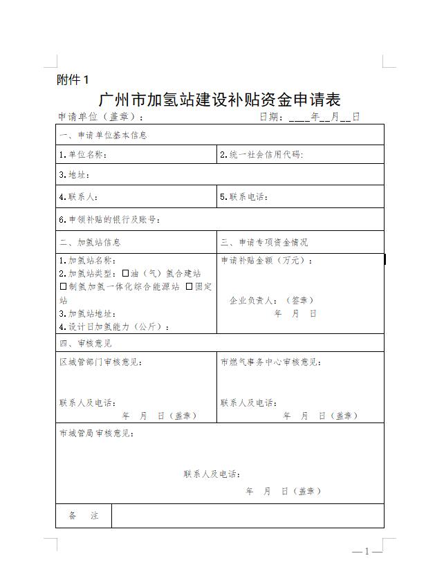 1.广州市加氢站建设补贴资金申请表(附件1);