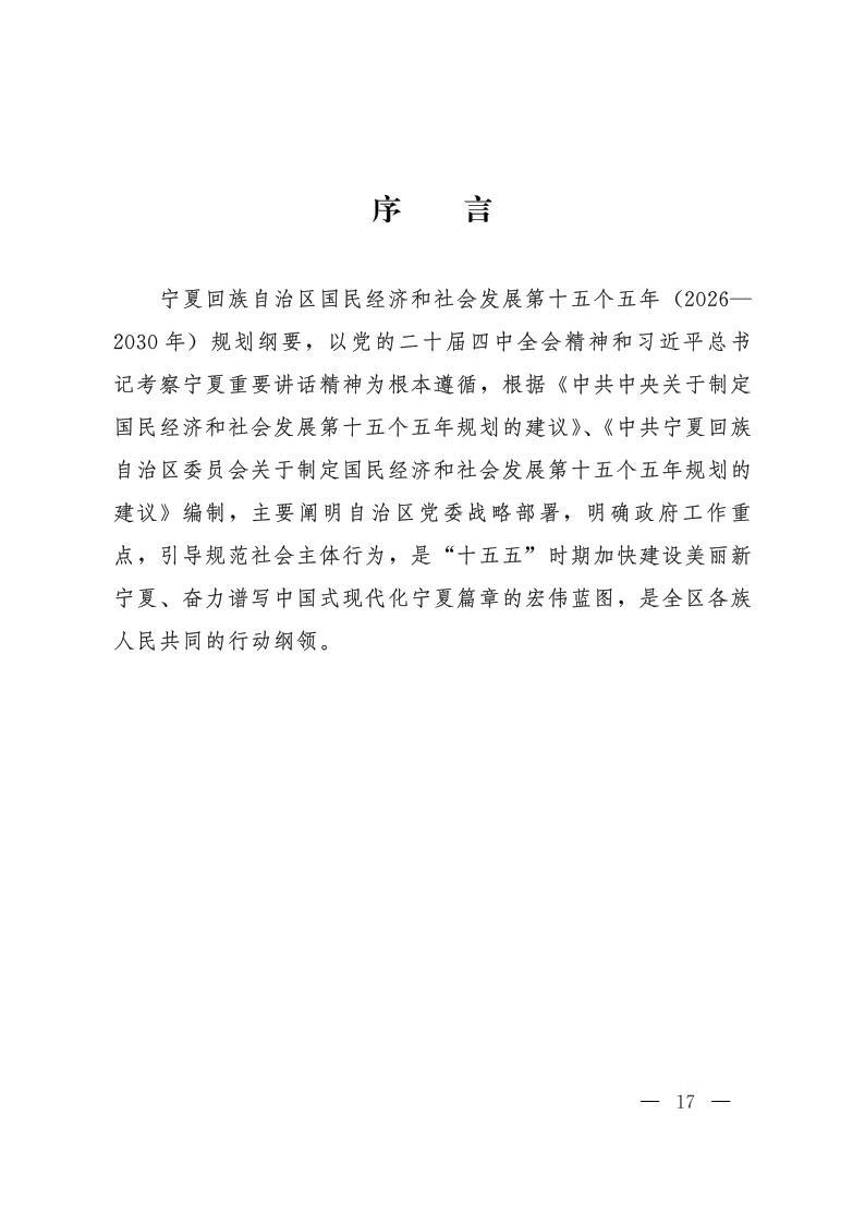 近日,宁夏回族自治区人民政府关于印发宁夏回族自治区国民经济和社会发展第十五个五年规划纲要的通知。