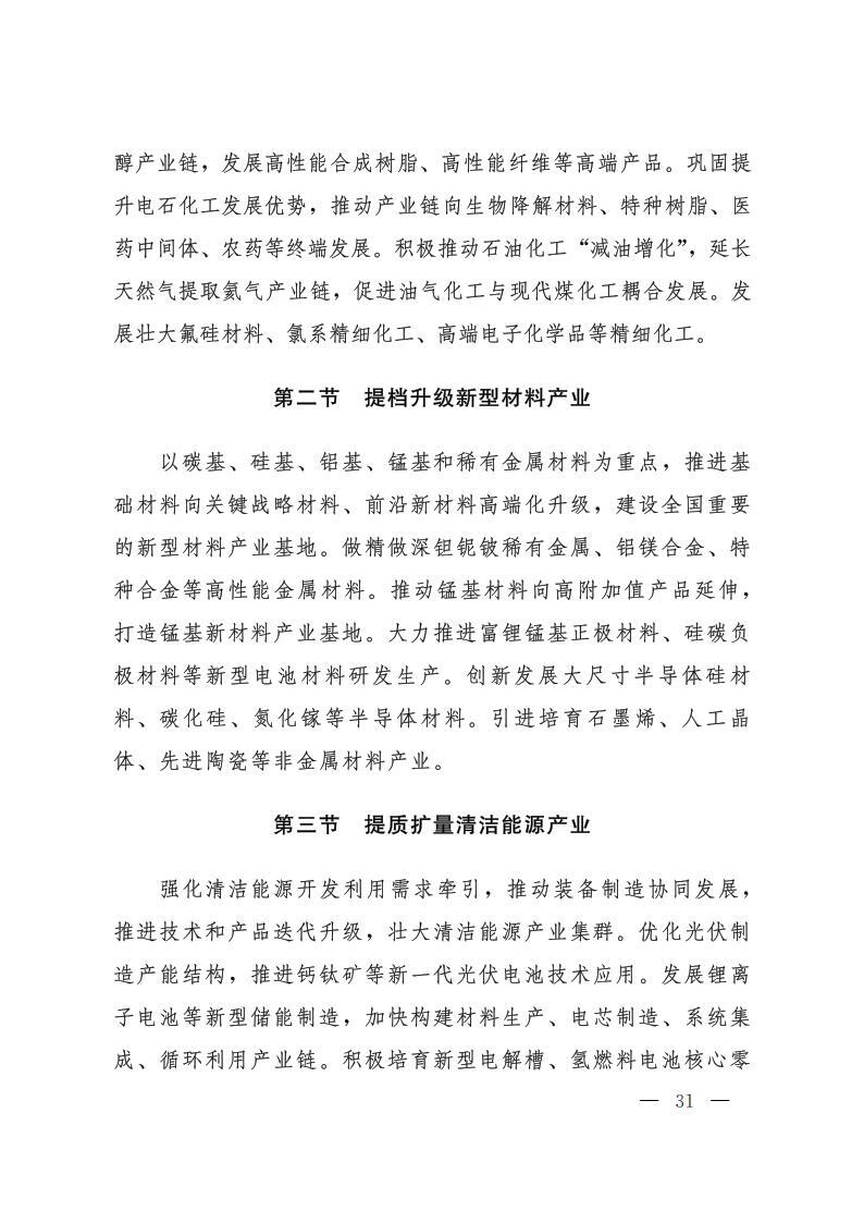文件指出,强化清洁能源开发利用需求牵引,推动装备制造协同发展,推进技术和产品迭代升级,壮大清洁能源产业集群。优化光伏制造产能结构,推进钙钛矿等新一代光伏电池技术应用。发展锂离子电池等新型储能制造,加快构建材料生产、电芯制造、系统集成、循环利用产业链。积极培育新型电解槽、氢燃料电池核心零部件制造。发展风电电机、风机减速器等关键装备,提升风电机组整机制造能力。