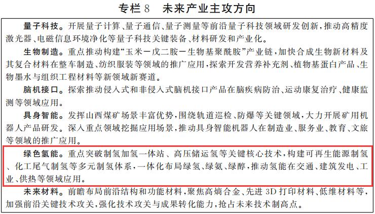绿色氢能。重点突破制氢加氢一体站、高压储运氢等关键核心技术,构建可再生能源制氢、化工尾气制氢等多元制氢体系,一体化布局绿氢、绿氨、绿醇,推动氢能在交通、建筑发电、工业、供热等领域应用。