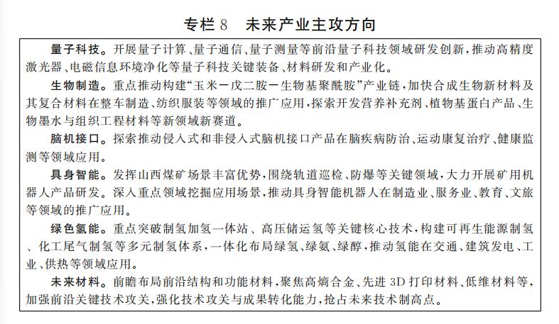 推动未来产业创新突破。坚持前瞻布局、技术引领、场景培育、开放协作的发展路径,聚焦量子科技、生物制造、脑机接口、具身智能、绿色氢能、未来材料等领域,突破颠覆性关键技术,打造标志性产品场景,探索可行商业模式,力争到2030年未来产业细分领域实现规模化发展。