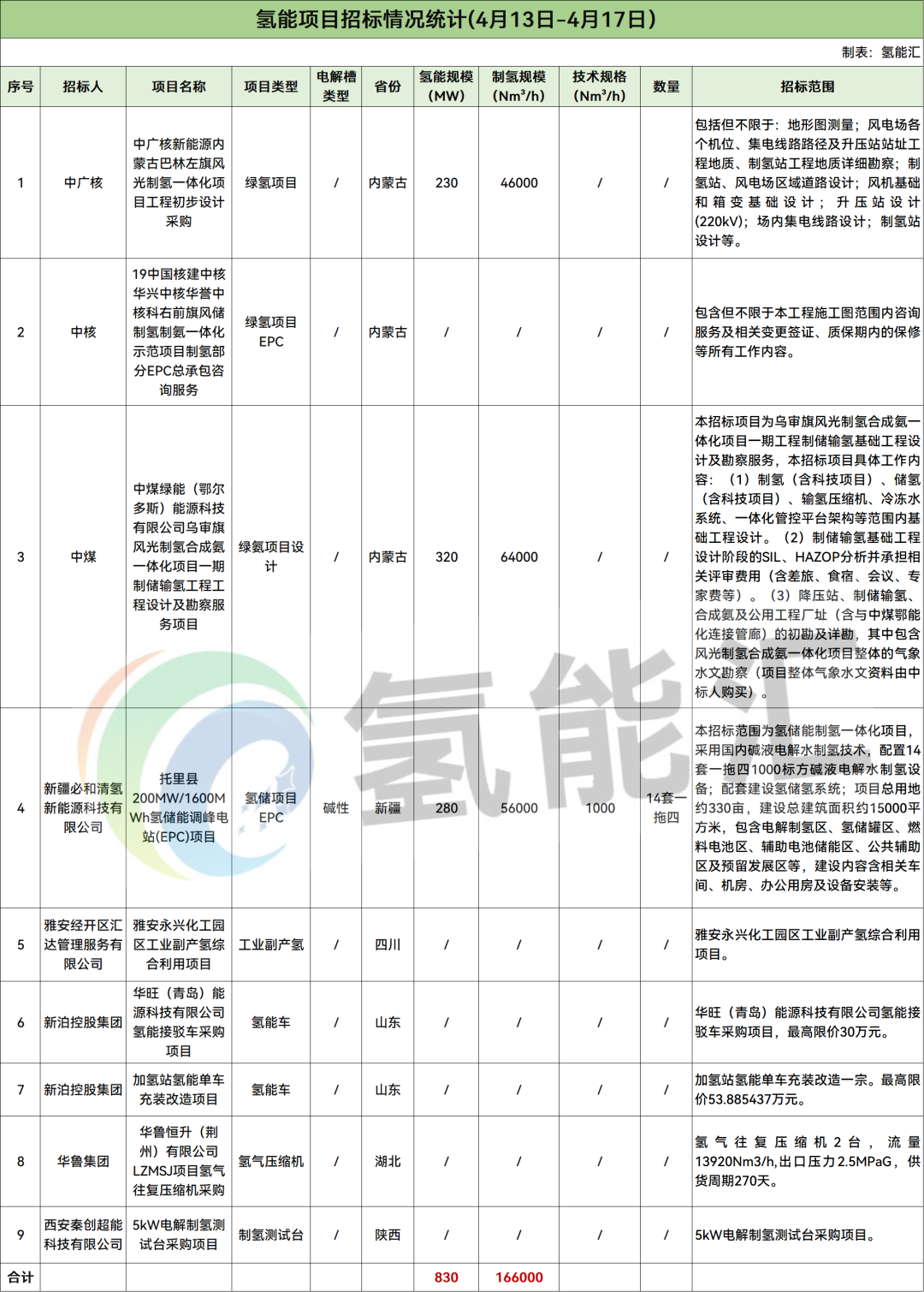 据能源圈统计,4月13日-4月17日氢能项目招投标方面,累计中标项目有5个;招标项目有9个,规模总计830MW,制氢规模总计166000Nm³/h。