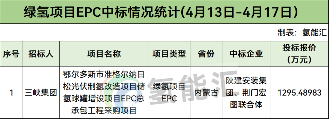 绿氢项目EPC有1个,招标人为三峡集团,中标企业为陕建安装集团、荆门宏图联合体。