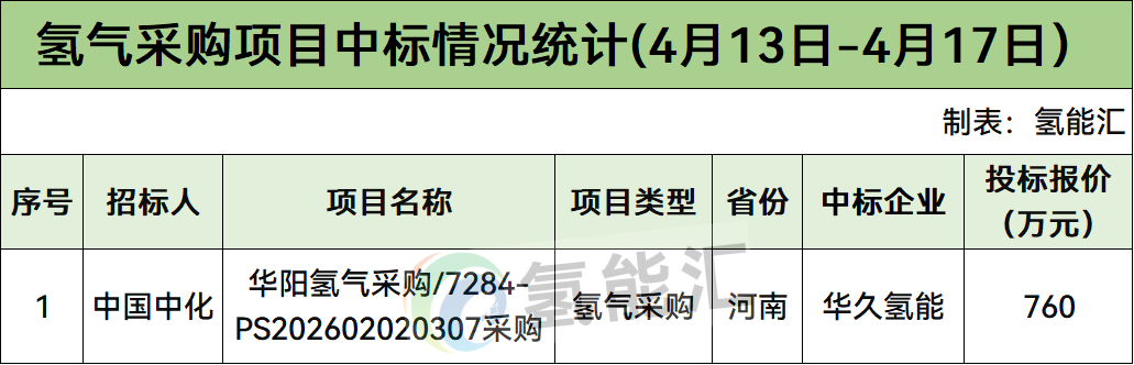 氢气采购项目有1个,招标人为中国中化,中标企业为华久氢能。