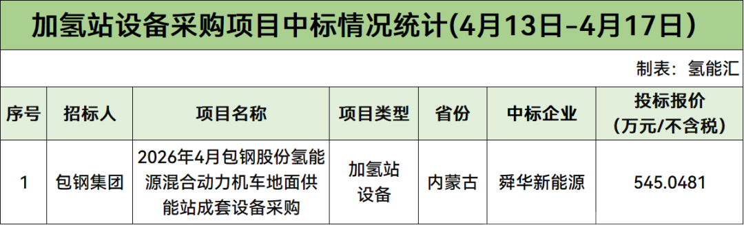 项目为2026年4月包钢股份氢能源混合动力机车地面供能站成套设备采购,中标人为舜华新能源,投标报价为545.0481万元/不含税。