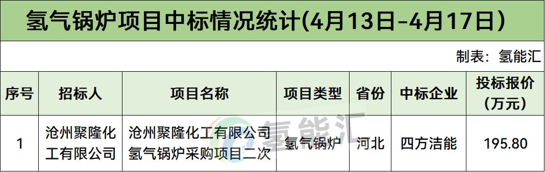 氢气锅炉项目有1个,招标人为沧州聚隆化工有限公司,中标企业为四方洁能。