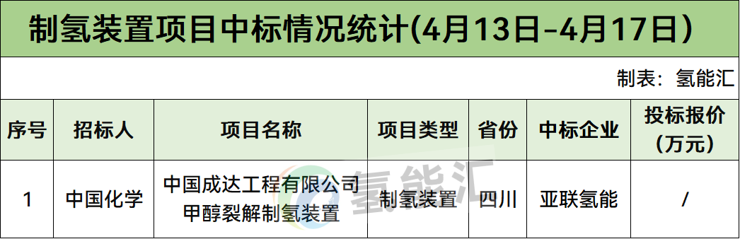 制氢装置项目有1个,招标人为中国化学,中标企业为亚联氢能。