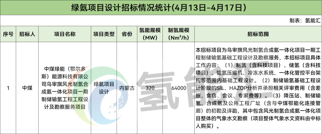 据能源圈统计,本周1个绿氨项目设计招标,规模为320MW,制氢规模为64000Nm³/h,项目为中煤绿能(鄂尔多斯)能源科技有限公司乌审旗风光制氢合成氨一体化项目一期制储输氢工程工程设计及勘察服务项目,招标人是中煤。