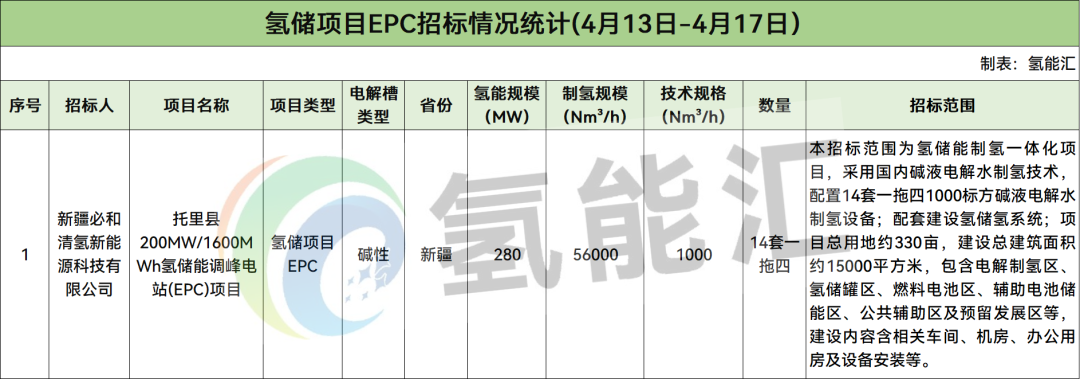氢储项目EPC有1个,招标人为新疆必和清氢新能源科技有限公司。