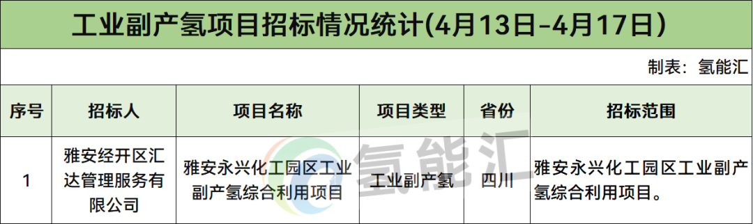 工业副产氢项目有1个,招标人为雅安经开区汇达管理服务有限公司。