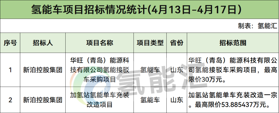据能源圈统计,本周2个氢能车项目招标,招标人为新泊控股集团。