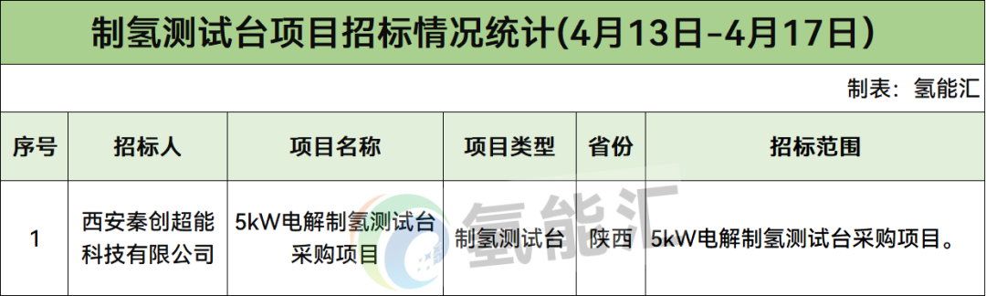 制氢测试台项目有1个,招标人为西安秦创超能科技有限公司。