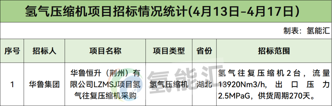 氢气压缩机项目有1个,招标人为华鲁集团。