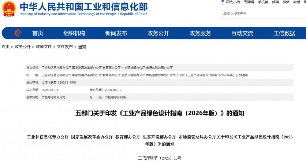 近日,工业和信息化部办公厅 国家发展改革委办公厅 教育部办公厅 生态环境部办公厅 市场监管总局办公厅关于印发《工业产品绿色设计指南(2026年版)》的通知。