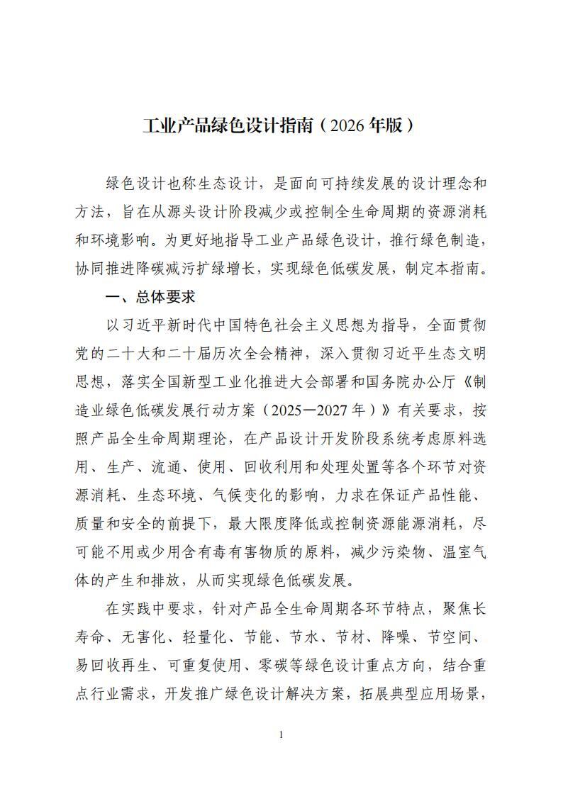 现将《工业产品绿色设计指南(2026年版)》印发给你们,请结合实际抓好贯彻落实。