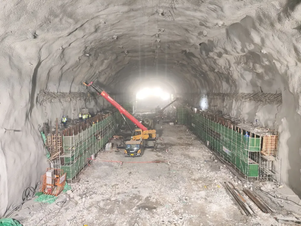 地下厂房工程由中国水利水电第七工程局有限公司承建,于2023年10月开工。岩壁吊车梁作为桥机运行轨道的基础,是整个地下厂房系统中质量要求最高、施工技术难度最大的部位,将承担后期发电机组安装、检修任务。岩壁吊车梁位于主厂房及安装间两侧边墙,上下游各长153米,于10月18日进行首仓混凝土浇筑,共浇筑混凝土1200立方米,采用全梁通仓支模、跳仓浇筑的方式进行施工。