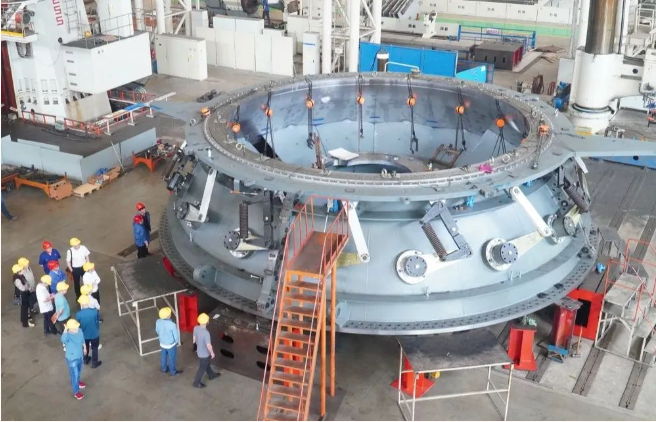 在转轮结构设计上,技术人员不断优化创新,如:转轮叶片双裙边、桨叶出水边防卡门涡、低水头发电泄洪设计,以及新型转轮用连杆销、双向“U”耐油耐压密封等。一系列技术创新成果,对于提高转轮刚强度和机组运行稳定性等起到了关键作用。在转轮的生产过程中,哈电电机智能制造工艺部、水电分厂等相关部门组成攻关团队,先后攻克了主轴加工、叶片装配等一系列难题,保证了关键工序之间无缝衔接,在团队成员的共同努力下,银江首台转轮装配密封试验、动作试验、平衡试验等试验内容,均一次性顺利通过。
