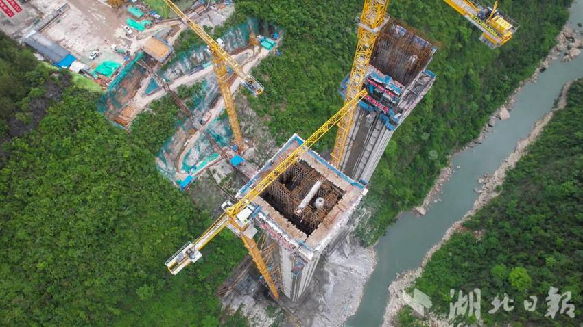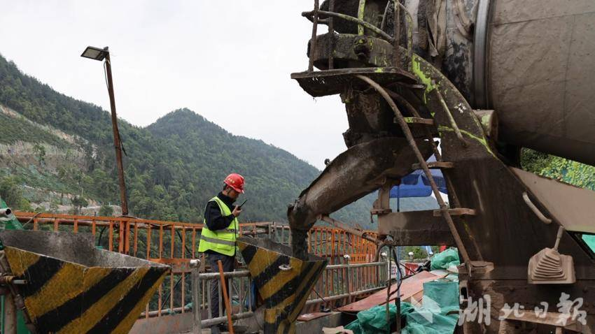 上午8时,位于咸丰县唐崖镇的利咸高速六标段大河特大桥施工现场,23号主墩施工封顶浇筑作业正在紧张进行。混凝土搅拌车通过高落差减速溜槽将混凝土输送至地泵,再经地泵输送到170米高的墩顶进行浇筑,整个过程预计耗时13个小时。