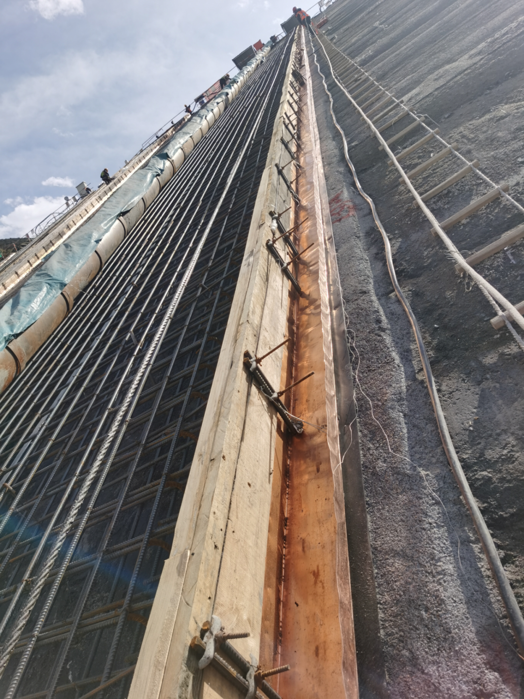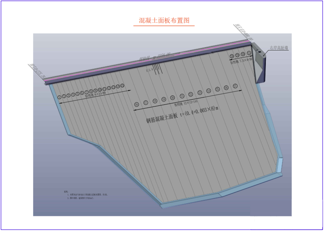 面板为重要的防渗部位,关系到工程运行安全和使用寿命,金川大坝面板最大长度约181米,两岸拉性区部位宽度为6米,河床压性区部位宽度为12米,厚度由底部最大厚度0.62米渐变至顶端厚度0.3米,分两期施工,一期面板设计浇筑方量为11788立方米,共计25块,二期面板设计浇筑方量为6354立方米,共计32块。