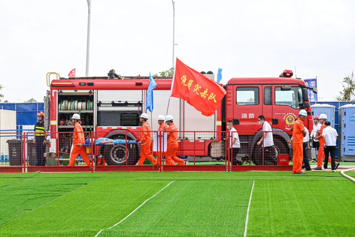 演练采用现场实操和视频讲解相结合的方式,模拟超强台风“摩羯”逼近海南,文昌市启动防汛防风应急响应后的场景。航天科创基地项目部按照防汛防风应急响应级别,及时启动防汛防风应急预案,有条不紊地开展临时加固、设备检修、调度应急物资、排水防涝、疏散人员、排查安全隐患、抢救伤员、有序复工复产等工作。应急、消防、医疗等多方资源联合协同,与项目部应急指挥部形成立体化作战体系,验证了在极端天气条件下工程防护、人员避险、资源调配等标准化处置流程的有效性,演示了在极端天气下,建筑工地项目如何联合多方专业资源,共同防灾减灾的作战经验。
