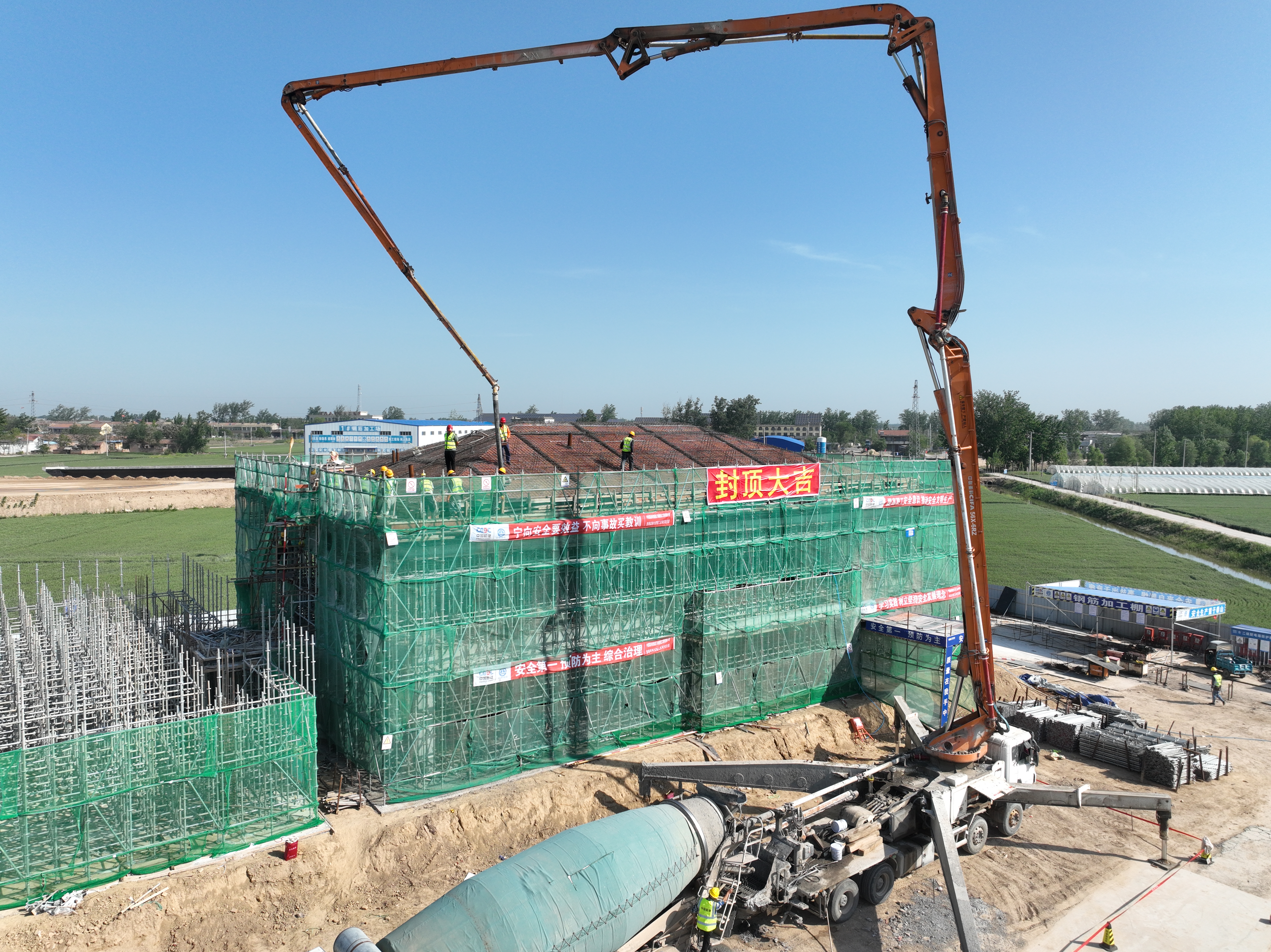 济宁至商丘高速公路成武至曹县段工程全长65.651公里,采用双向六车道高速公路标准建设,共设有4个收费站,1个服务区。此次顺利封顶的白浮图收费站,位于成武县白浮图镇,分为地下一层和地上二层施工,高度11.269米,总占地面积6000平方米。建设内容包含综合楼、交警执法用房,收费站及辅助用房等,建筑面积1643.54平方米,收费站车道设置3进3出6车道,主要用于高速收费服务及其他配套功能。