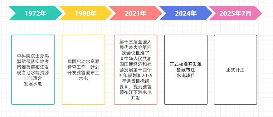 据《水利工程建设与管理》报道,雅鲁藏布江在我国境内长2,057公里,流域面积高达24.05万平方公里,位居全国第五,年平均净流量高达1,654亿立方米,位居全国第四。其干流和五大支流天然水能蕴藏量超1亿千瓦,位居全国第二,仅次于长江。单位面积天然水能蕴藏量则每公里高达460千瓦,位居全国大河之首,是长江流域的3倍。雅鲁藏布江拐弯处的大峡谷,全长504.6公里,最深处6,009米。早在1972年,中科院院士孙鸿烈就带队实地考察雅鲁藏布江时,发现雅鲁藏布江蕴藏丰富的水能资源,1980年,我国启动水资源普查工作,计划在雅鲁藏布江发展水电项目。但是由于雅鲁藏布江位于高海拔地区,地质条件特殊,因为受到当时水电开发技术不完备、当地基础硬件设施不足等问题困扰,这份规划一致处于论证状态。直到2021年3月,第十三届全国人民代表大会第四次会议批准了《中华人民共和国国民经济和社会发展第十四个五年规划和2035年远景目标纲要》,提出“推进能源革命,建设清洁低碳、安全高效的能源体系,提高能源供给保障能力”,明确了“实施雅鲁藏布江下游水电开发”。让人们看到了开发雅鲁藏布江水电等希望。2024年中共中央、国务院印发《关于加快经济社会发展全面绿色转型的意见》提出加快西南水电清洁能源基地建设,标志雅江下游水电开发工程进入落地阶段。