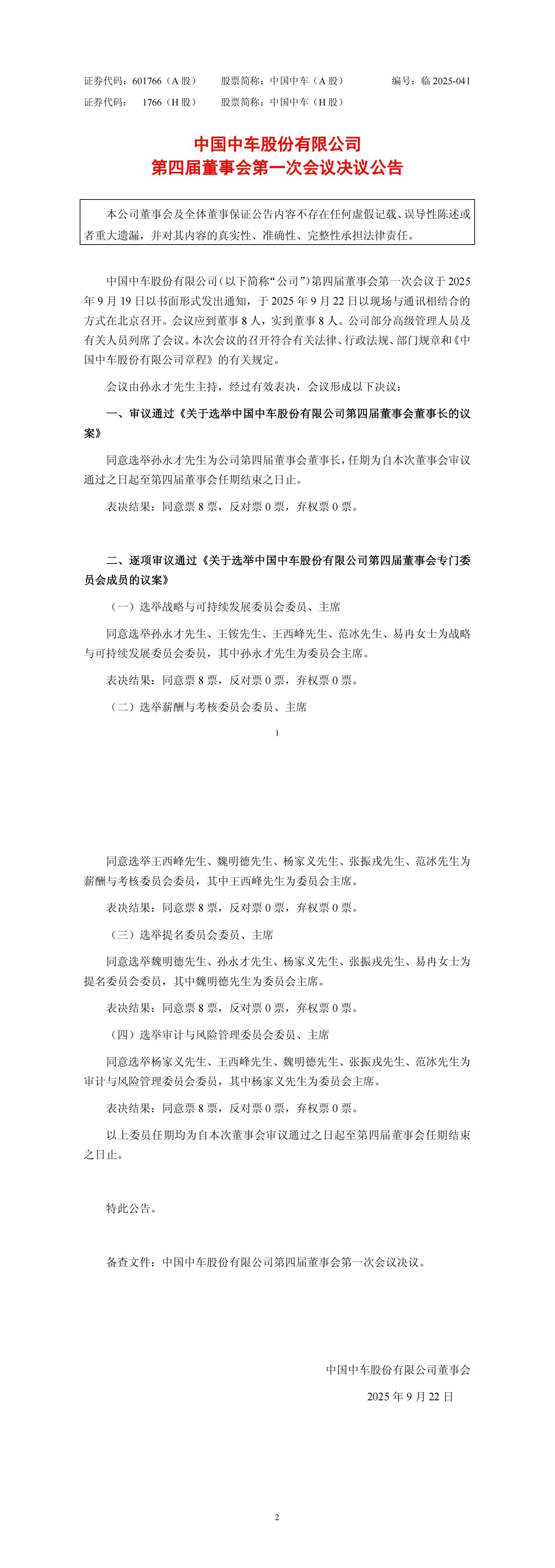 9月22日,中国中车股份有限公司第四届董事会第一次会议在北京召开,审议通过董事长选举议案,同意孙永才当选公司第四届董事会董事长,任期自本次会议审议通过之日起至第四届董事会任期结束。
