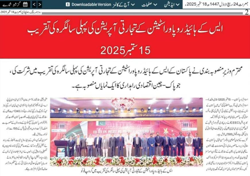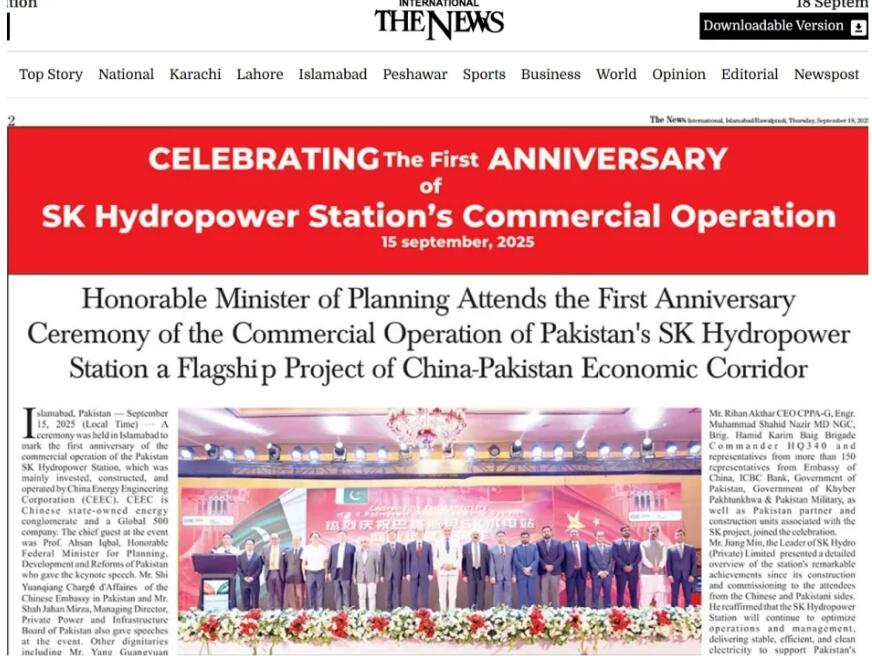 巴基斯坦具有广泛影响力的英文媒体THE NEWS报道称,SK水电站一年来为巴基斯坦能源事业发展做出了重大贡献,已经成为促进巴基斯坦经济增长、保障民生用电的关键力量。