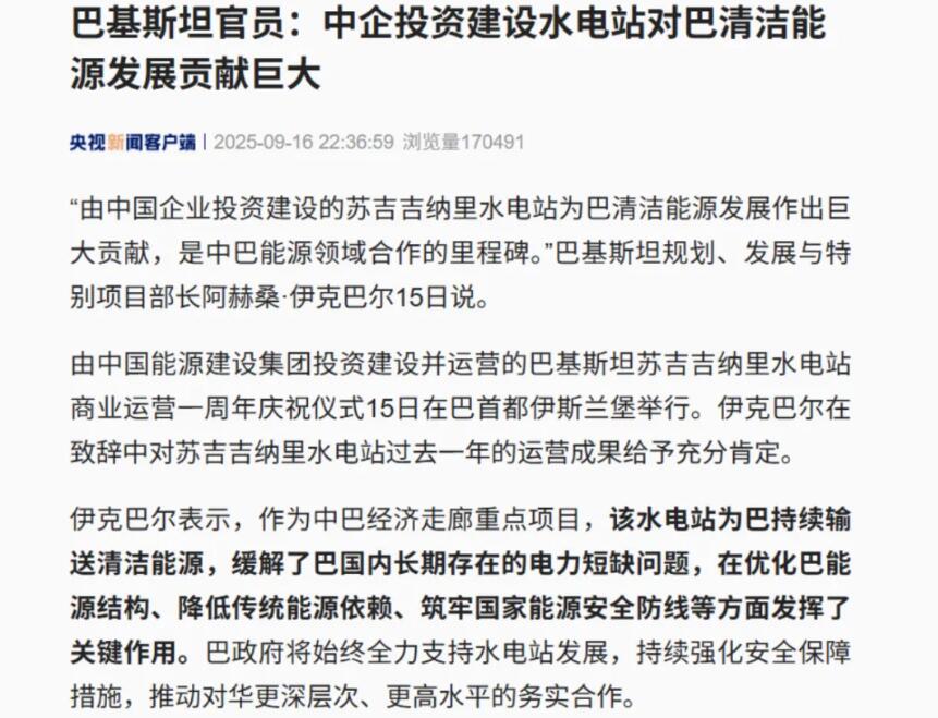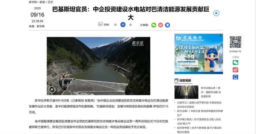 新华社报道称,SK水电站为巴基斯坦持续输送清洁能源,缓解了巴国内长期存在的电力短缺问题,在优化巴能源结构、降低传统能源依赖、筑牢国家能源安全防线等方面发挥了关键作用。