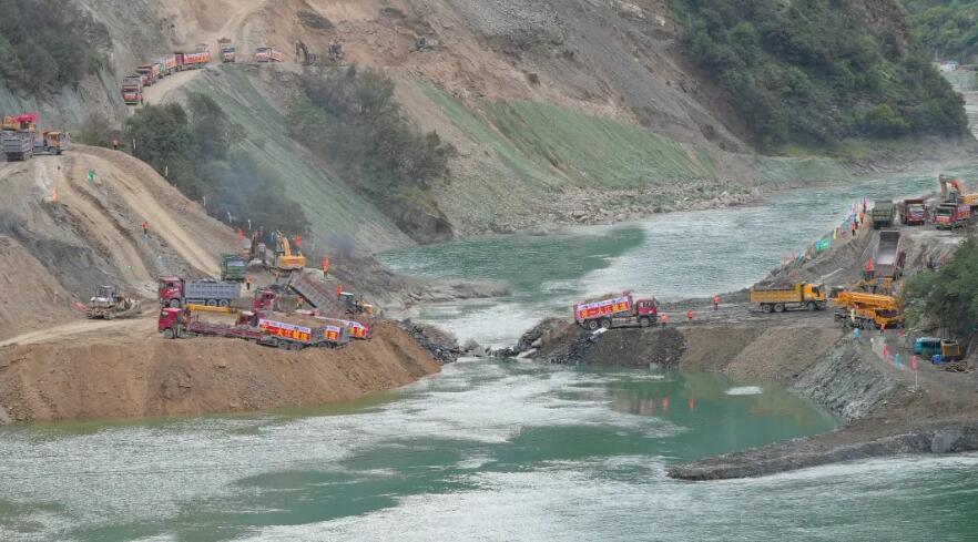 在截流施工过程中,牙根一级水电站采用了双向立堵截流方式,有效应对了最大落差约3.5米、最大流速约5.7米每秒的挑战。通过精准的水文预报、截流模型试验以及施工方案的持续优化,成功降低了截流施工难度,提高了合龙的成功率与安全性。整个截流过程中,抛填石料总量达数万立方米,历时不到30个小时,展现了高效、精准的施工能力。