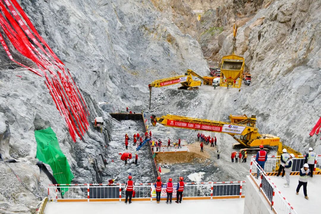 无先例可依、无范本可循、无成熟经验可借鉴,每一步探索都伴随着未知的风险。项目管理团队牵头组建技术攻坚小组,先后邀请行业顶尖专家召开论证会,优化完善浇筑施工方案。在摸索中前行,逐一攻克高寒地区高流速高落差狭窄地形截流、坝基保护层一次开挖、重力坝混凝土多设备联合入仓浇筑、堆石坝无人驾驶碾压填筑、坝体同步提升施工衔接、接触带胶凝砂砾石填筑、面板混凝土配合比优化与抗裂性能提升等7大难题,将“不可能”变为现实。