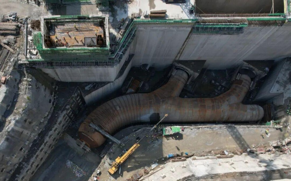 本次完成水压试验的岔管群包含1个泄压管和3个支管,最大公切球直径14.6米,最大板厚130毫米,充水后总重超过12000吨,尺寸与施工难度均为目前世界之最。