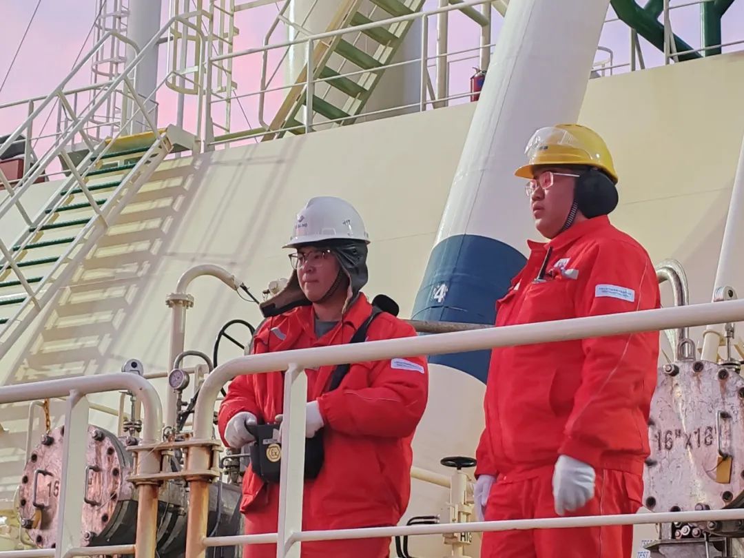 2024年底,LNG船期如密集鼓点,三天两船、八天四船的高频次到港,犹如一场场严峻的大考。接船保供任务作为重中之重,时间紧、任务重、工况复杂是最大的难点。在海关、海事、边检等地方政府部门大力支持下,跨年的“青龙”号与上一船“阿尔祖巴拉”号无缝衔接,实现船舶“送出去、接进来”的精准操控,从接卸流程的有序推进,到设备的稳定运行与维护,中国海油盐城“绿能港”运维及疏浚团队严正以待,每一个环节都紧密相扣,顺利完成了2025年开门首船接卸任务。