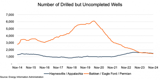 即将上任的特朗普政府承诺将放松监管限制,让行业“尽情钻探”。大多数业内人士对此反应良好,并预计联邦土地的许可程序将加快。此外,达拉斯联邦储备银行能源调查显示,大选后上游生产商的活动和前景有所上升。该行业受到鼓舞。然而,正如大学橄榄球播音员李·科索所说——“别那么急,我的朋友!”美国大部分活跃的石油活动不是在联邦土地上,而是在私人或州土地上。此外,石油是一种全球性大宗商品,而不是区域性大宗商品,而且似乎 2025 年的供应将趋向于供过于求,而不是紧张。最新的《短期能源展望》估计,到 2025 年,OPEC+ 以外的产量将增加约 160 万桶/天,而同期需求仅增加约 120 万桶/天。美国、加拿大和南美洲将引领这一趋势。