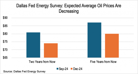 这种情绪也延续到了长期预测中。截至本文撰写时,NYMEX 曲线处于正价差状态,这意味着期货价格低于当前价格。2028 年 12 月合约低于 64 美元。达拉斯联储调查的受访者对整体价格更为乐观,但他们的预测也显示出类似的下降趋势。平均而言,预测较低价格的受访者多于预测较高价格的受访者。两年期价格预测从 2024 年 9 月的 81 美元降至 2024 年 12 月的 74 美元。长期预测也是如此。