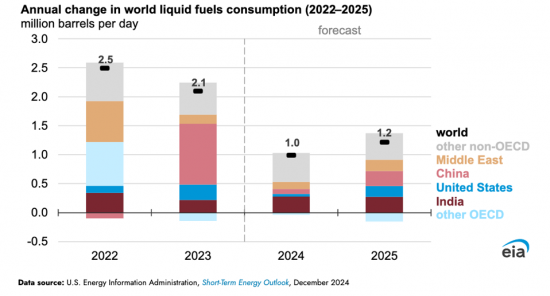 全球对石油的需求正在增长。美国能源信息署 (EIA) 估计石油消费量将增加 120 万桶/日。然而,增长速度已经放缓,尤其是在中国。与 2023 年相比,2024 年的需求增长几乎减少了一半。中国每天的进口量比 2023 年底减少了 30 万桶。通货紧缩压力和银行业问题继续减少需求。印度也已成为全球最大的石油需求国。