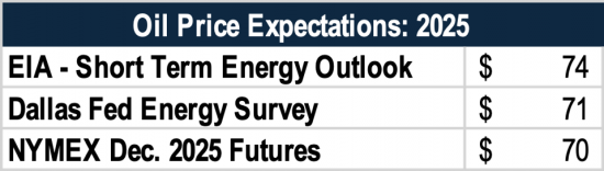 所有这些因素,以及我在此未涉及的更多因素,都导致 2025 年油价市场疲软。美国能源信息署 (EIA)、达拉斯联储调查和纽约商品交易所期货目前都估计今年的油价将在 70 美元以下。当然,这些估计可能会有所不同,而且油价对地缘政治事件非常敏感,因此这些估计可能会很快被抛诸脑后。然而,供应过剩和全球需求减弱使市场处于相对弱势的定价地位。