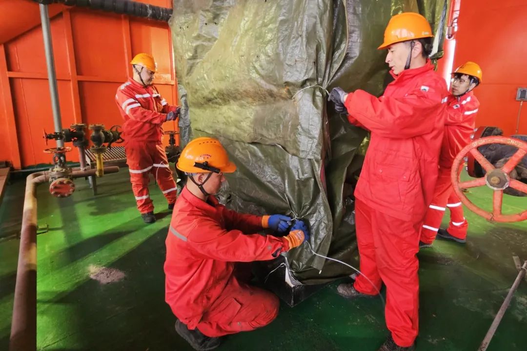 钻完井技术中心督导各作业施工点及时组织悬臂梁回收、甩钻具、井架锁紧、机具防护捆扎及活动载荷固定等各项工作,中控室严格落实24小时双人值班制度,加强海面瞭望,做好应急处置准备。针对作业六号插桩入泥浅,施工周期长,物料存储吊装遮盖加固工作量大的实际,作业监督任鹏带头组织优化吊装方案,在规定节点完成抗风准备,确保大风期间安全平稳。