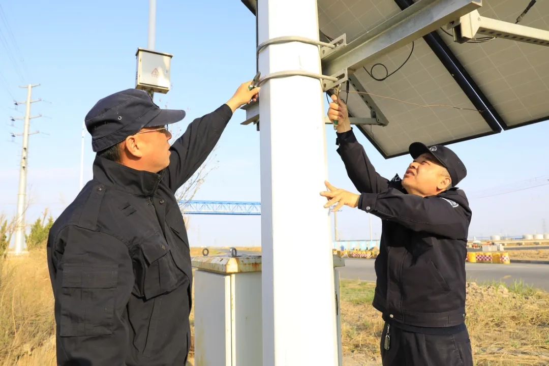 海上生产巡护中心强化责任落实与风险防控措施,组织党员骨干成立突击队24小时备勤值守,确保突发险情快速响应处置。同时,针对外输管道架空管段、穿跨越段等高风险区域,加密巡查频次并实施动态监控,全力筑牢油区安全防线。4月12日下午5时,海区巡护二班党小组长生磊带领员工颜怀政巡逻至新508线桩埕路口,发现视频监控塔太阳能板固定卡被风吹松动,迅速取来扳手固定,确保视频监控安全运行。