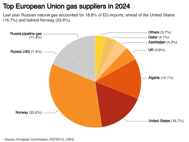 欧洲约有19%的天然气仍来自俄罗斯,通过土耳其溪管道和液化天然气运输-低于2022年前的约45%。