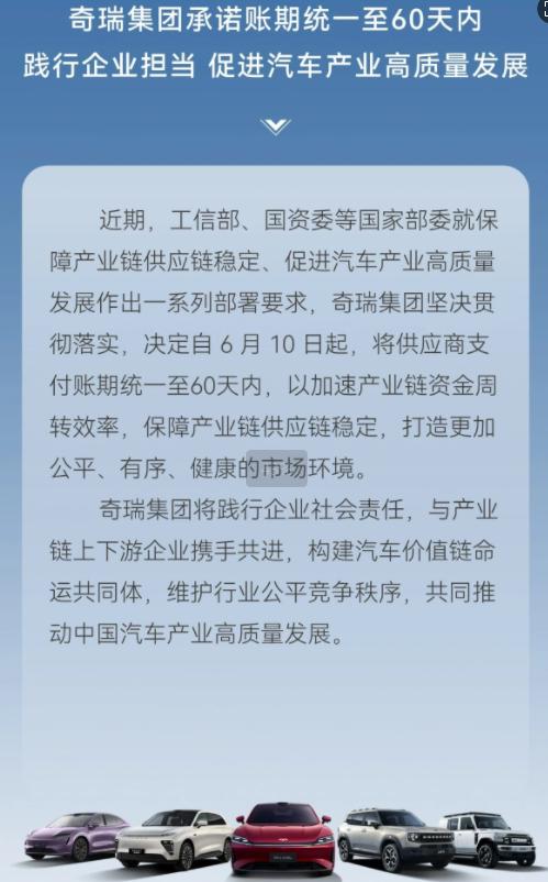 奇瑞集团还称,将践行企业社会责任,与产业链上下游企业携手共进,构建汽车价值链命运共同体,维护行业公平竞争秩序,共同推动中国汽车产业高质量发展。