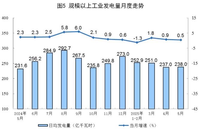 规上工业电力生产平稳增长。5月份,规上工业发电量7378亿千瓦时,同比增长0.5%,增速比4月份放缓0.4个百分点;日均发电238.0亿千瓦时。15月份,规上工业发电量37266亿千瓦时,同比增长0.3%,扣除天数原因,日均发电量同比增长1.0%。
