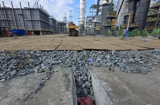 为解决装置大件吊装预留区域对后期安装工作严重制约以及预留区场地异常紧张等问题,公司项目团队经反复论证,确定了“管廊土建基础和管廊模块预制同步实施、整体运输、顶升就位”的施工工法,并对模块运输线路路基采取“换填”的临时保护措施,进一步优化施工工期,保证了项目关键路径受控。