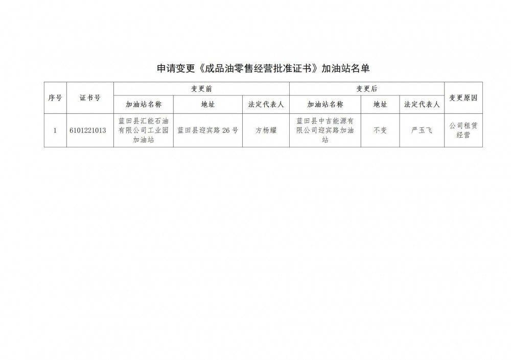 根据《商务部办公厅关于印发〈石油成品油流通行业管理工作指引〉的通知》(商办消费函〔2020〕439号),《陕西省成品油零售经营资格审批管理办法》(陕商发〔2022〕43号)有关规定,市商务局对阎良区申请的陕西中昌工贸有限公司郭靳路加油站新建资料、长安区申请的陕西省石油化工工业贸易有限公司子午服务区南(北)加油站验收资料、浐灞国际港申请的中石油东三环便利加油站验收资料、蓝田县申请的汇能石油公司工业园加油站变更资料进行了审核,相关验收资料符合要求,拟同意核发、变更《成品油零售经营批准证书》,现予以公示,公示期为2025年7月7日-2025年7月11日(5个工作日)。如有异议,请于公示期满前,将有关材料邮寄或传真至市商务局(流通业发展处)。