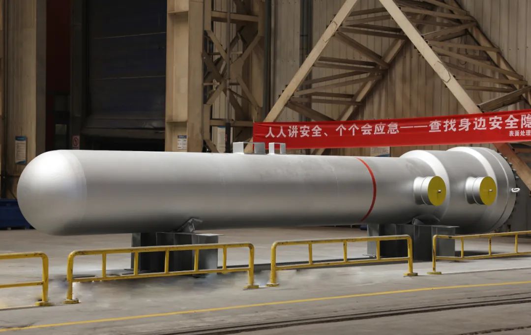 此次交付的高压隔膜换热器,是对服役近10 年设备的升级,延续了兰石重装在高压换热领域整体设计简洁、密封结构可靠、制造成本较低等优势。采用Q345R(HIC)抗氢致开裂材质,直径 1000mm、长度9800mm、重量30吨。通过管程与壳程介质的高效换热,可显著提升装置运行效率与产品质量。