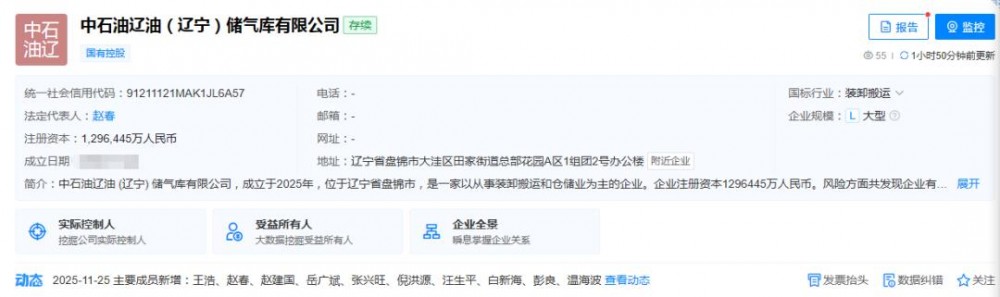 国家企业信用信息公示系统显示,11月24日,中石油辽油(辽宁)储气库有限公司成立,注册资本129.6亿元,法定代表人赵春。