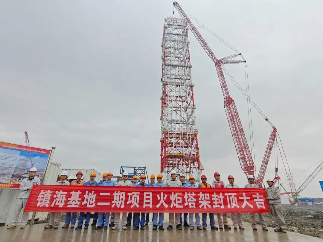 镇海项目火炬塔架安装,合理划分塔架模块,设计优化分段位置组装平台,采用内置免拆吊耳,仅用25天完成模块吊装组对,较同类工程提前15天,创下国内同类型火炬施工新速度,同时不仅提升了安装效率,还降低了高空作业风险。