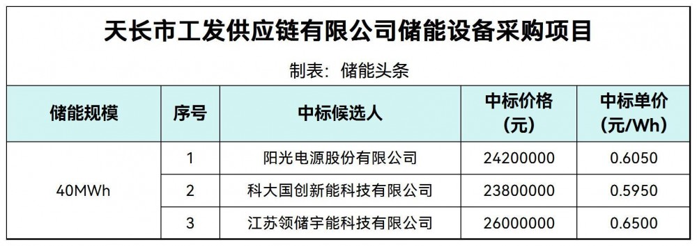 第一中标候选人为阳光电源股份有限公司,投标报价24200000元,折合单价0.605元/Wh;第二中标候选人为科大国创新能科技有限公司,投标报价23800000元,折合单价0.595元/Wh;第三中标候选人为江苏领储宇能科技有限公司,投标报价26000000元,折合单价0.65元/Wh。